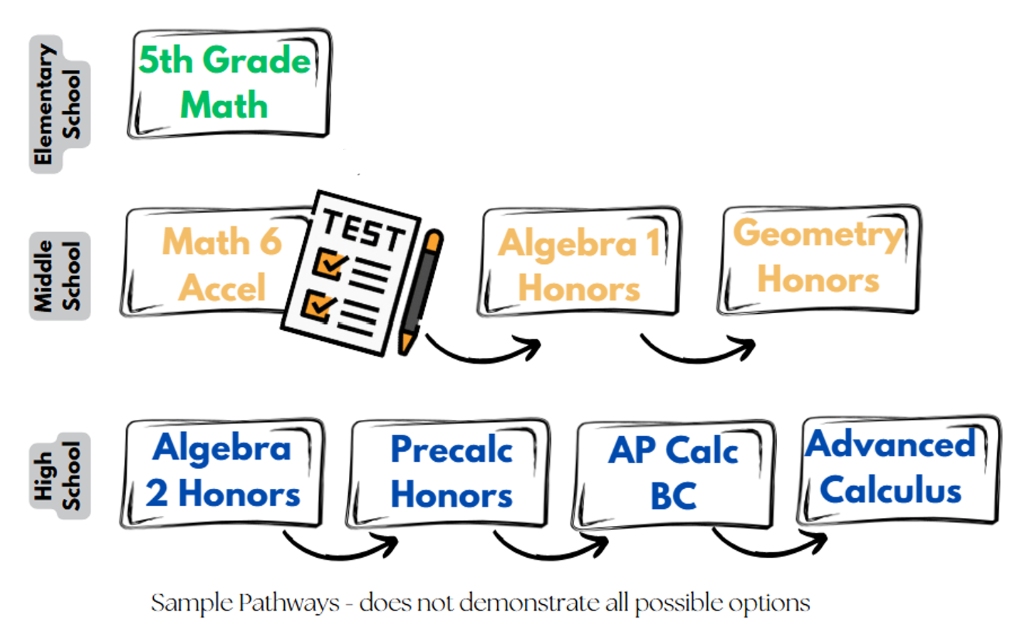 Acceleration through the intermediate school pathways is granted by demonstration by meeting 2 of the 3 requirements from (a) – (c) AND meeting requirement (d). Please note, assessments for acceleration will be administered each spring.